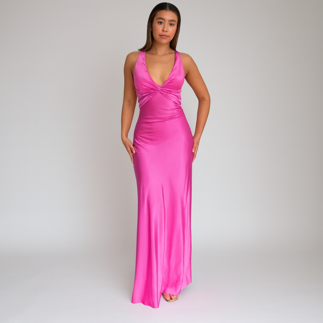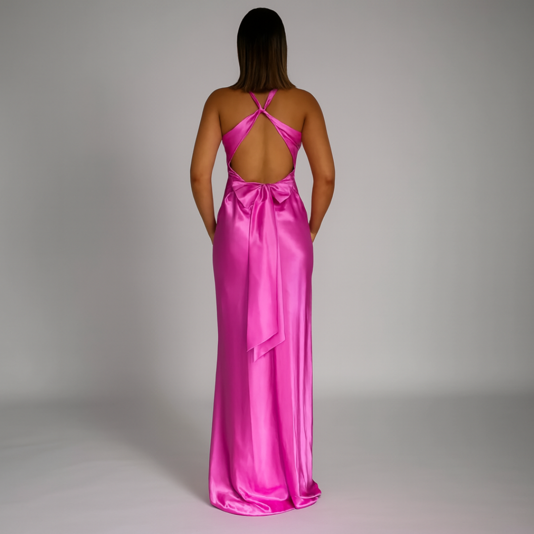 Long, backless dress in luxurious satin. Halter neck with twisted detail for an elegant and flattering look. Perfect for summer weddings, evenings out, and formal occasions.